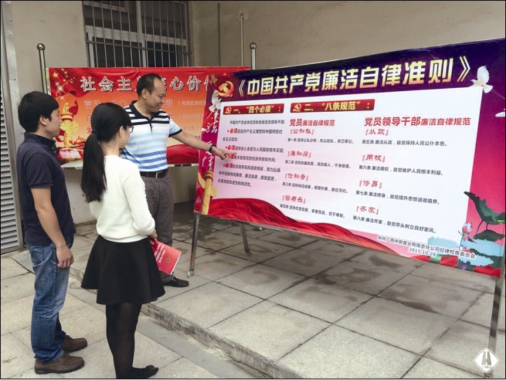 為增強(qiáng)學(xué)習(xí)貫徹的自覺性、主動(dòng)性,把學(xué)習(xí)貫徹與具體工作實(shí)際結(jié)合起來,公司紀(jì)檢監(jiān)察室在第一時(shí)間進(jìn)行宣傳貫徹。一是以短信形式,向公司全體黨員和中層以上干部發(fā)送2期《廉政知識(shí)學(xué)習(xí)卡》短信,并就“妄議中央”、“老鄉(xiāng)會(huì)、校友會(huì)、戰(zhàn)友會(huì)”、“四類人員不得買賣股票”、“社會(huì)主義核心價(jià)值觀”等內(nèi)容分4次發(fā)送短信進(jìn)行解讀,以最快捷的方式、最簡潔的字句讓黨員干部及時(shí)了解和知曉《準(zhǔn)則》和《條例》的關(guān)鍵內(nèi)容;二是組織黨委中心組成員集中專題學(xué)習(xí);三是制作四版《準(zhǔn)則》和《條例》宣傳版報(bào),分別布置于二樓、三樓辦公走廊;四是為全體黨員訂購人手一份《中國共產(chǎn)黨廉潔自律準(zhǔn)則、中國共產(chǎn)黨紀(jì)律處分條例、中國共產(chǎn)黨章程》單行本,全部發(fā)放到每一位黨員手中,要求原原本本、逐字逐句認(rèn)真學(xué)習(xí);五是在公司OA信息系統(tǒng)黨務(wù)紀(jì)工團(tuán)門戶發(fā)布通知學(xué)習(xí)。