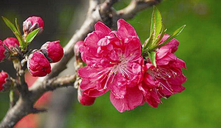 桃花,屬薔薇科,落葉小喬木,高可達6一8米。樹干灰褐色,粗糙有孔。小枝紅褐色或褐綠色,平滑。葉橢圓狀披針形,邊緣有細鋸齒?;▎紊邪?、粉紅、紅等色,重瓣或半重瓣,花期3月。核果近球形,表面密被短絨毛,因品種不同,果熟6一9月。